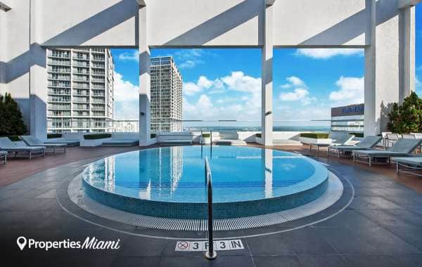 The 500 Brickell complex provides high-end amenities including a rooftop infinity swimming pool. The pool has a spacious sundeck with loungers and dining tables. The condos' residents and guests can enjoy overlooking views of the city and the bay here.
